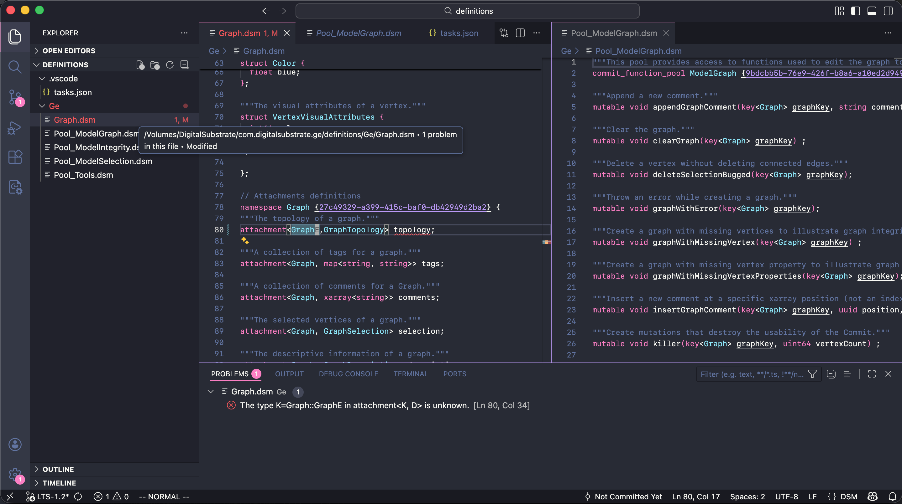VS Code editor showing DSM file with syntax highlighting for keywords, types, and UUIDs